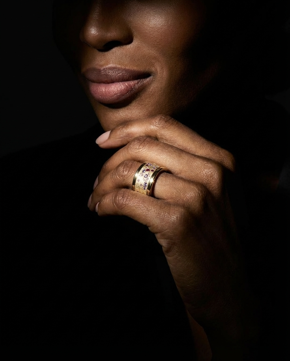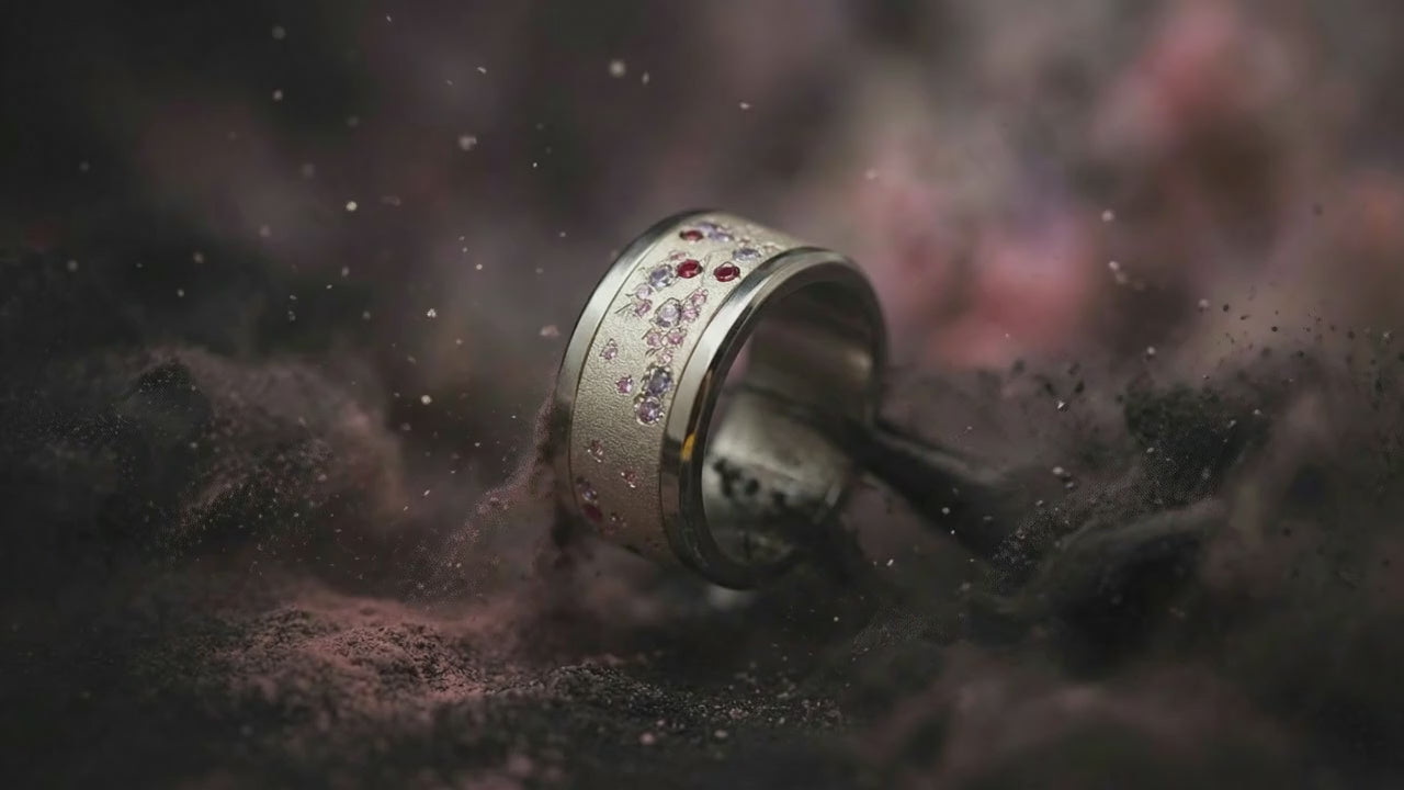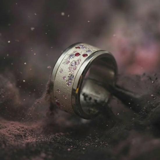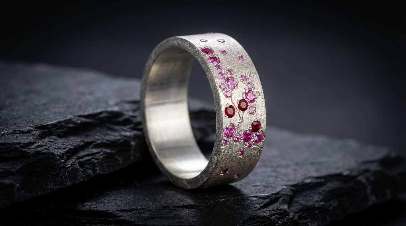 Art der Edelsteine: zwölf 1.6mm Rubine, achtzehn 1.6mm helle malvenrote Saphire, sechsundvierzig 0.8mm helle malvenrote Saphire