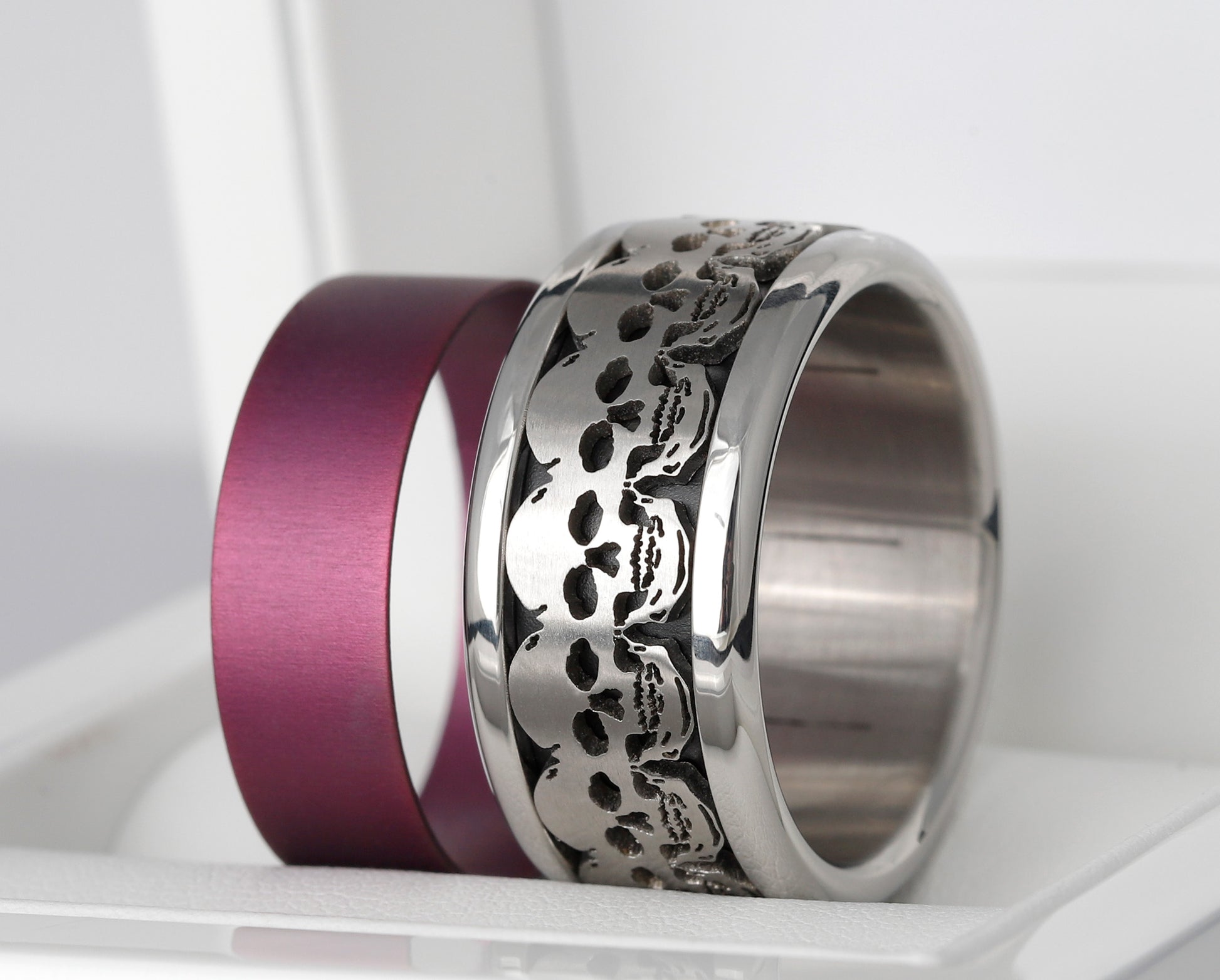 Bague complète en acier "Skull 3D acier découpé" inclus 2 inserts aluminium (aubergine et noir) - Taille 56