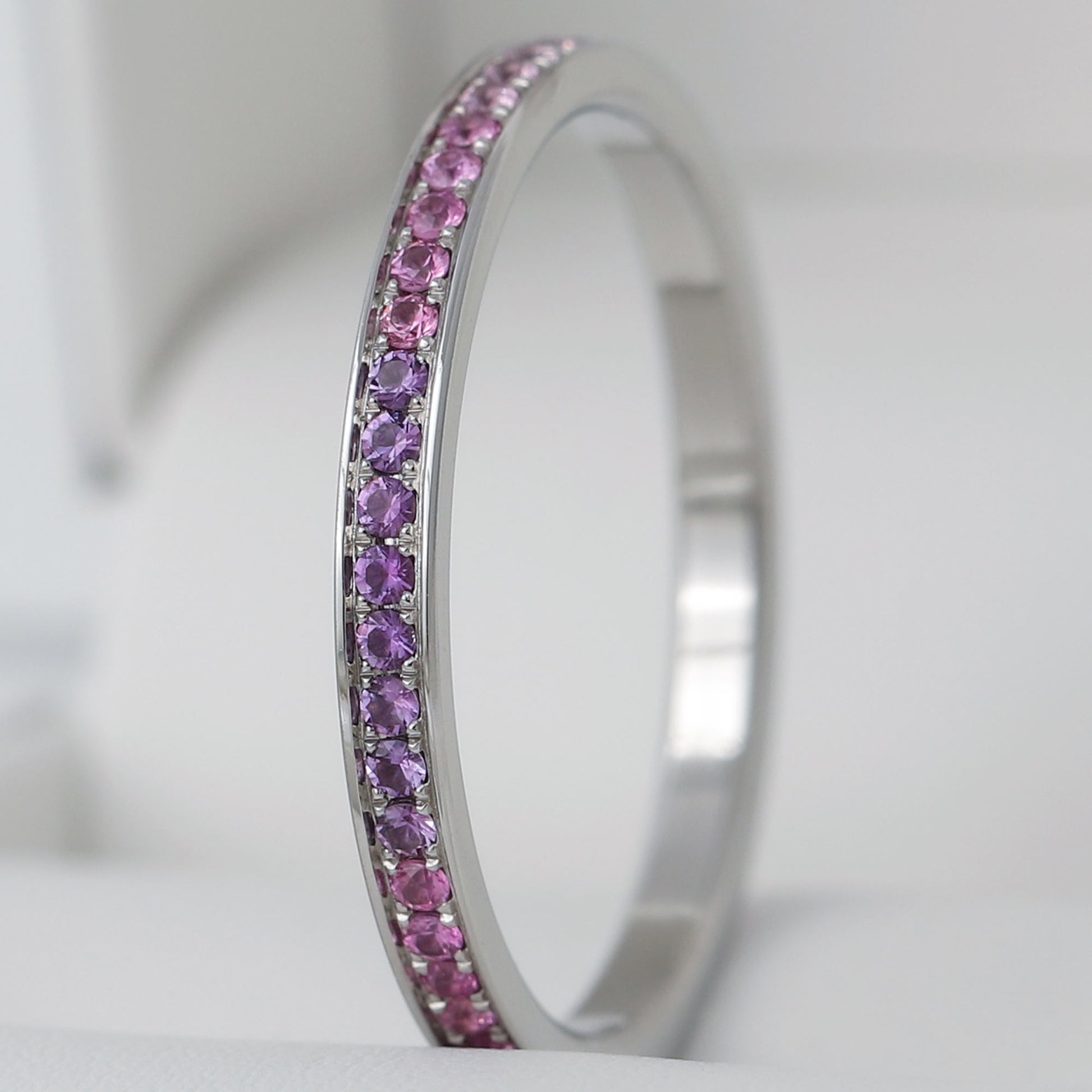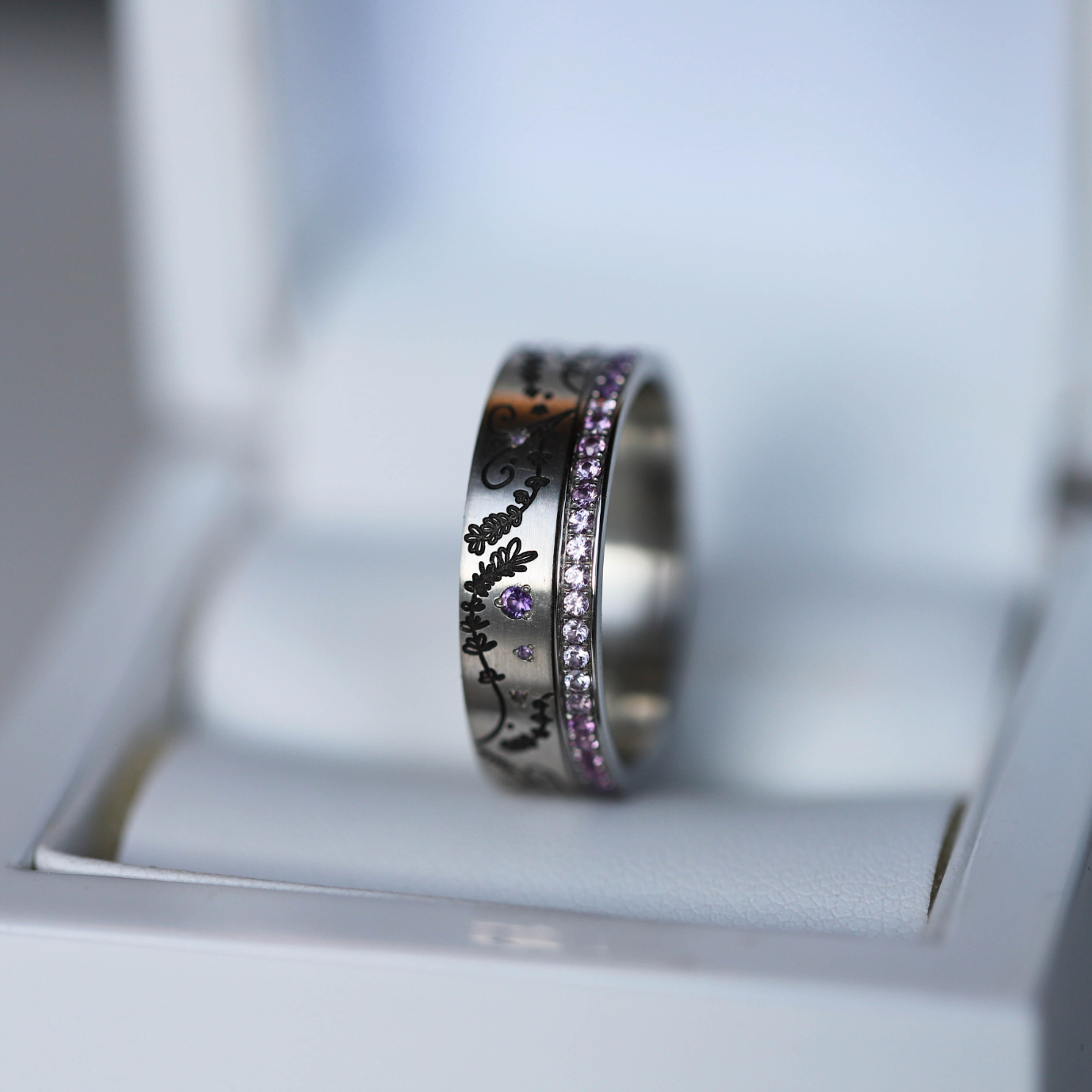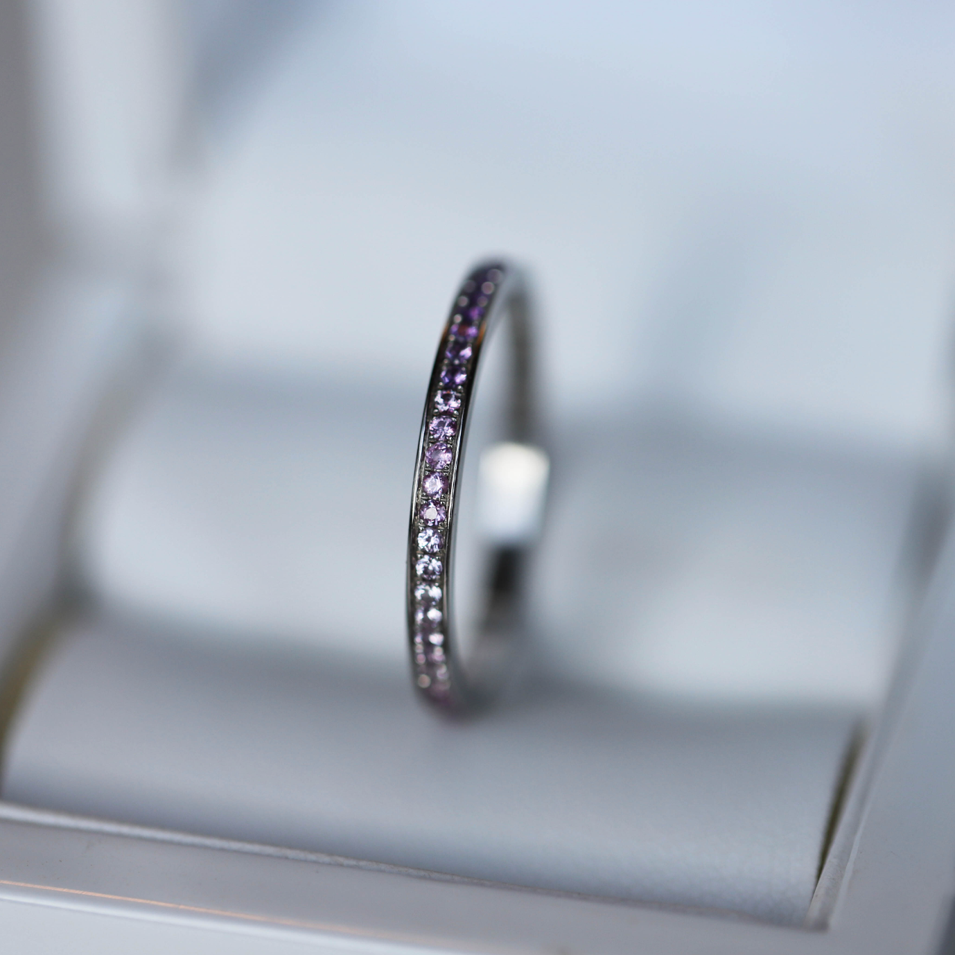 Composition du coffret: anneau deux tiers en argent "Lavande" serti d'améthystes et anneau fin (medium) entièrement serti de saphirs roses et d'améthystes 1.3mm. Base offerte avec (base small arrondie et polie)