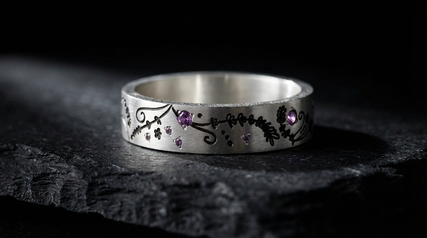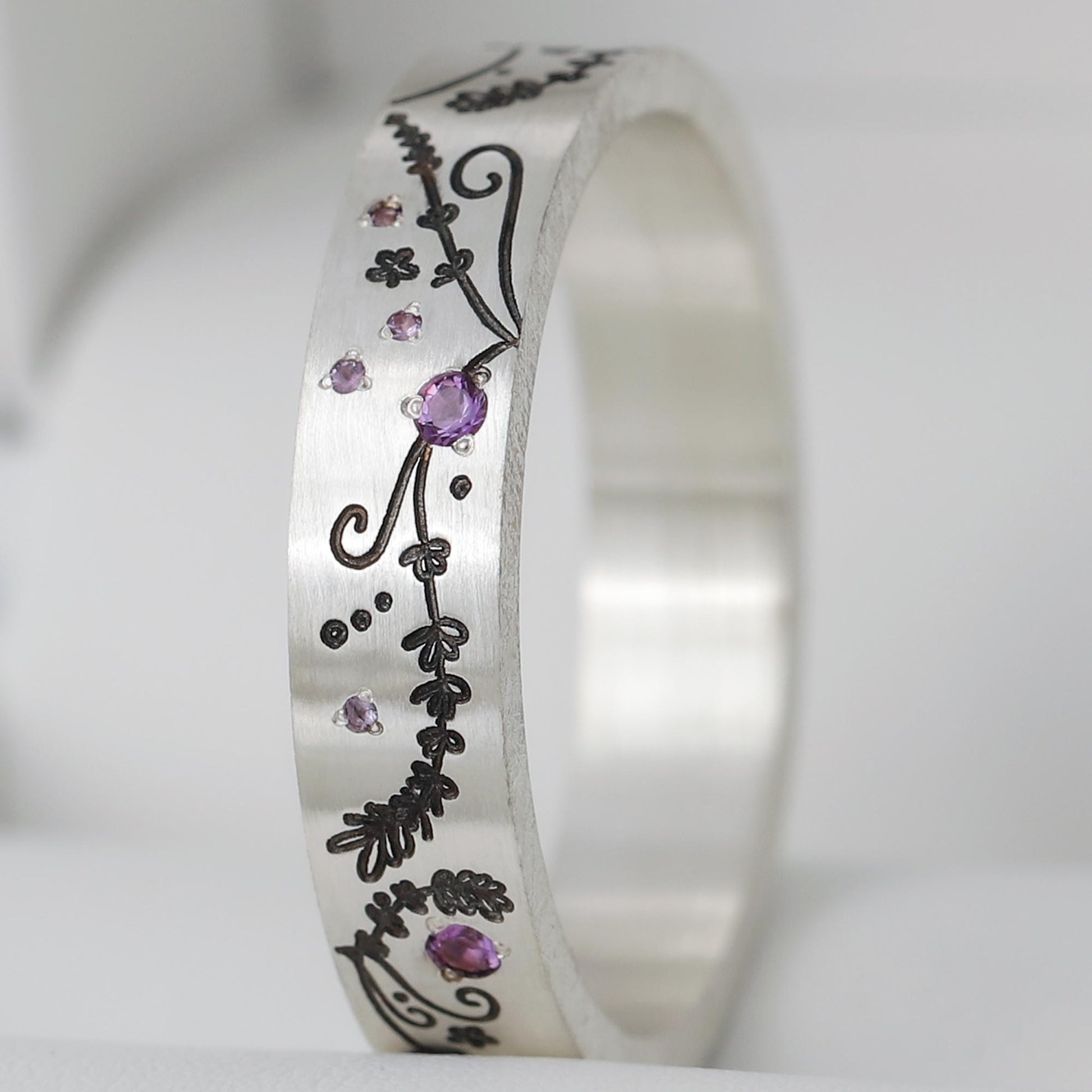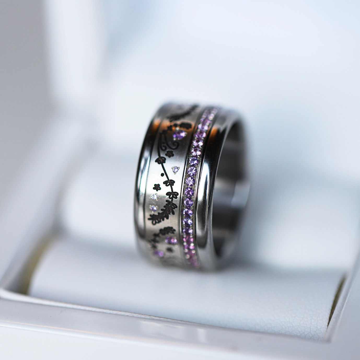Composition du coffret: anneau deux tiers en argent "Lavande" serti d'améthystes et anneau fin (medium) entièrement serti de saphirs roses et d'améthystes 1.3mm. Base offerte avec (base small arrondie et polie)